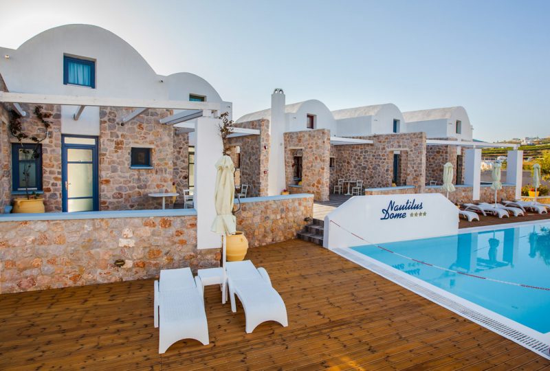 Nautilus Dome Suites is built on the side of the caldera, featuring a pool surrounded by a wooden deck with sun loungers and umbrellas. Enjoying Aegean Sea and volcano views, Nautilus would be your ideal choice for your vacation in Santorini.